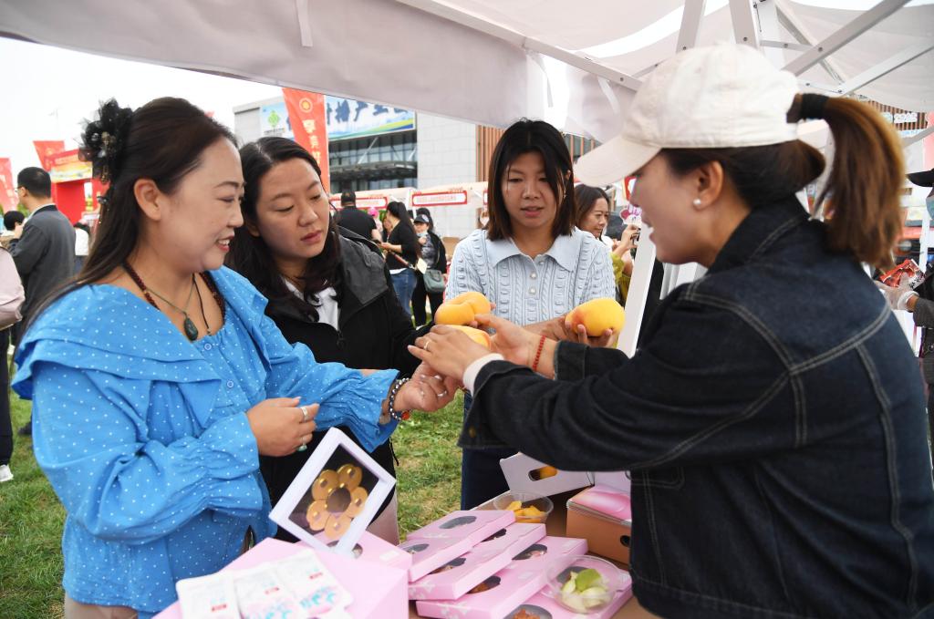 9月19日,北京市平谷區(qū)舉辦2025年中國農(nóng)民豐收節(jié)暨第36屆北京農(nóng)民藝術(shù)節(jié)“鄉(xiāng)村大舞臺(tái)”平谷區(qū)專場展演。工作人員(右一)在活動(dòng)現(xiàn)場向市民介紹農(nóng)產(chǎn)品。新華社記者 任超 攝