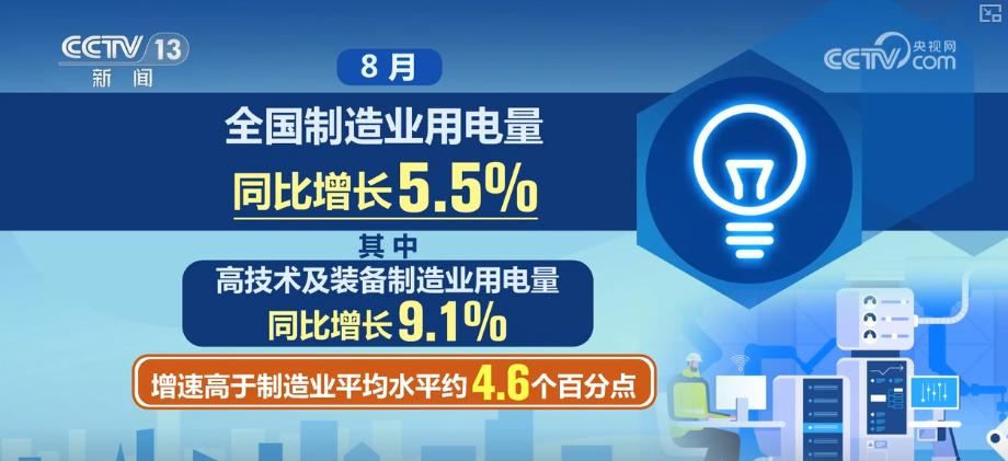 數(shù)據(jù)顯示,8月,全國(guó)制造業(yè)用電量同比增長(zhǎng)5.5%。其中,高技術(shù)及裝備制造業(yè)用電量同比增長(zhǎng)9.1%,增速高于制造業(yè)平均水平約4.6個(gè)百分點(diǎn)。