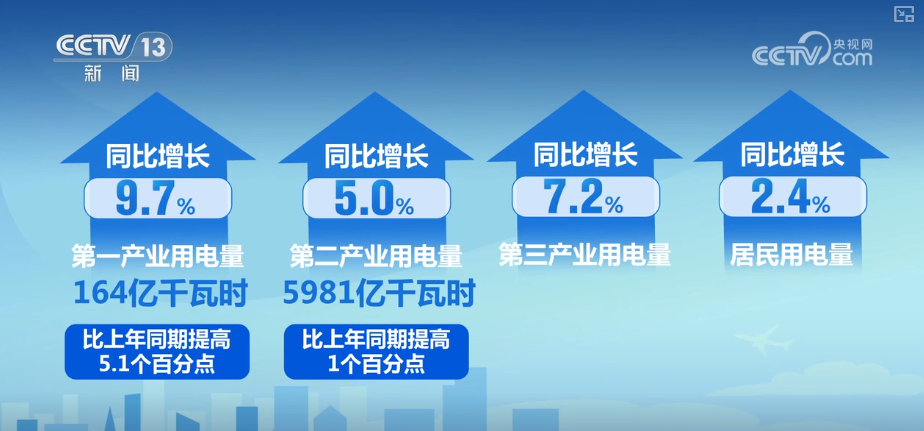 數(shù)據(jù)顯示,第一產(chǎn)業(yè)和第二產(chǎn)業(yè)用電量保持較快增長(zhǎng),第三產(chǎn)業(yè)和居民用電量有所回落。具體看,第一產(chǎn)業(yè)用電量164億千瓦時(shí),同比增長(zhǎng)9.7%,比上年同期提高5.1個(gè)百分點(diǎn);第二產(chǎn)業(yè)用電量5981億千瓦時(shí),同比增長(zhǎng)5.0%,比上年同期提高1個(gè)百分點(diǎn);第三產(chǎn)業(yè)和居民用電量分別同比增長(zhǎng)7.2%和2.4%。