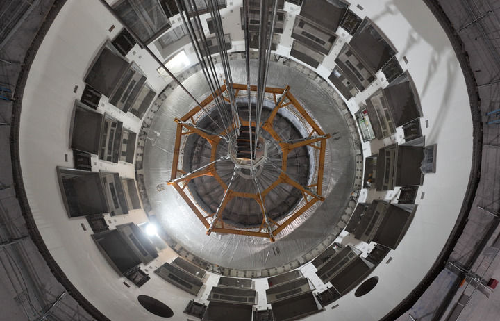 這是2025年10月1日在安徽合肥未來大科學城緊湊型聚變能實驗裝置(BEST)建設現(xiàn)場拍攝的成功落位安裝的杜瓦底座(無人機照片)。新華社記者 周牧 攝