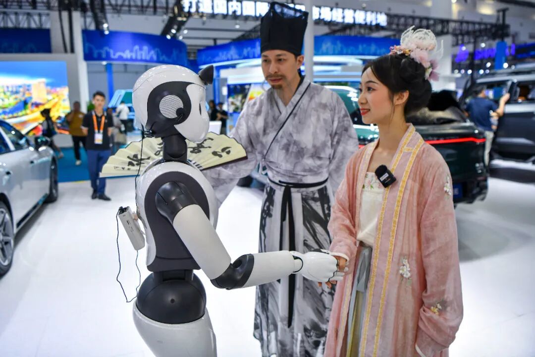 2024年4月15日,海南海口,第四屆中國國際消費品博覽會上,身著漢服的參觀者與“柔美人形智能服務機器人”互動。中新社記者 駱云飛 攝