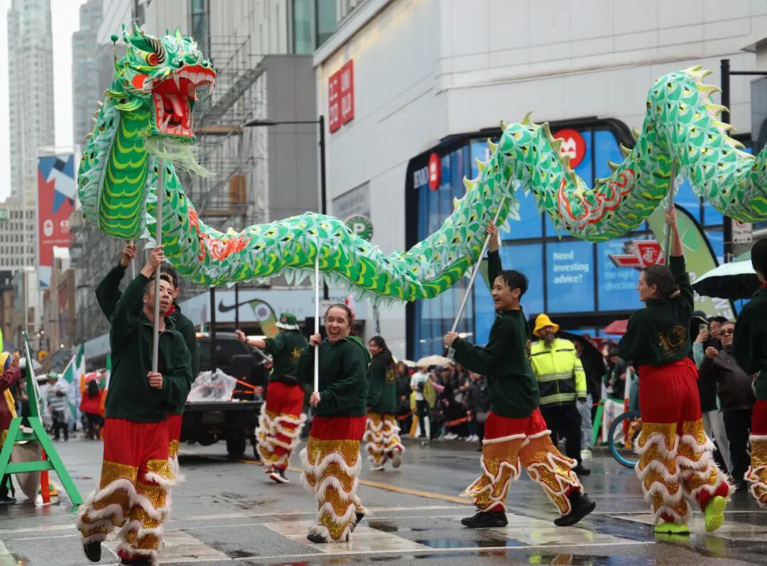 當?shù)貢r間2025年3月16日,加拿大多倫多,在慶祝愛爾蘭民族傳統(tǒng)節(jié)日圣帕特里克節(jié)(St. Patrick’s Day)的大游行中,一支中式舞龍隊舞動綠色長龍。中新社記者 余瑞冬 攝