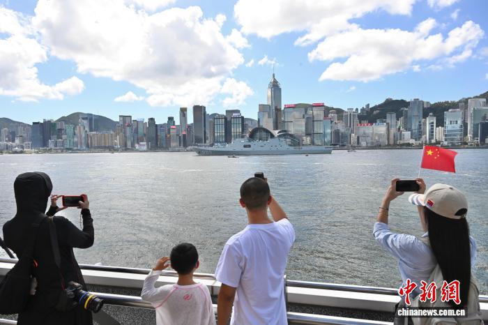 10月3日,海軍戚繼光艦、沂蒙山艦編隊完成出航前的各項準備工作,駛離香港海域,前往柬埔寨、泰國、新加坡三國。尖沙咀碼頭有民眾送別海軍戚繼光艦、沂蒙山艦編隊。圖為民眾在尖沙咀碼頭拍攝海軍沂蒙山艦。 中新社記者 李志華 攝