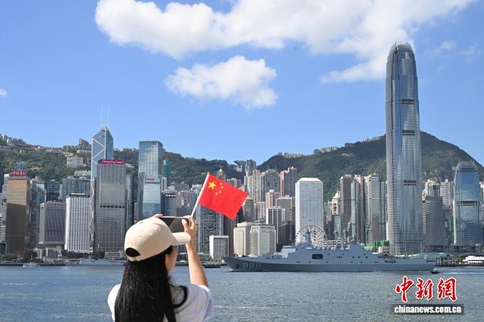 圖為一位女士手持五星紅旗在尖沙咀碼頭拍攝海軍沂蒙山艦。 中新社記者 李志華 攝