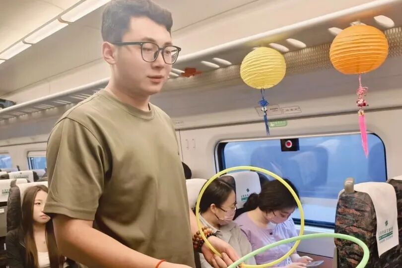 車(chē)廂內(nèi),懸掛的燈籠點(diǎn)綴出濃濃節(jié)日氣息。青年職工演唱歌曲《看月亮爬上來(lái)》,熟悉的旋律引發(fā)旅客共鳴;“舉頭望明月(打一中藥名)”等趣味猜燈謎活動(dòng),吸引不少旅客踴躍參與;身著漢服的乘務(wù)員帶領(lǐng)孩子們玩起傳統(tǒng)套圈游戲,月餅、玩偶作獎(jiǎng)品,歡聲笑語(yǔ)不斷。