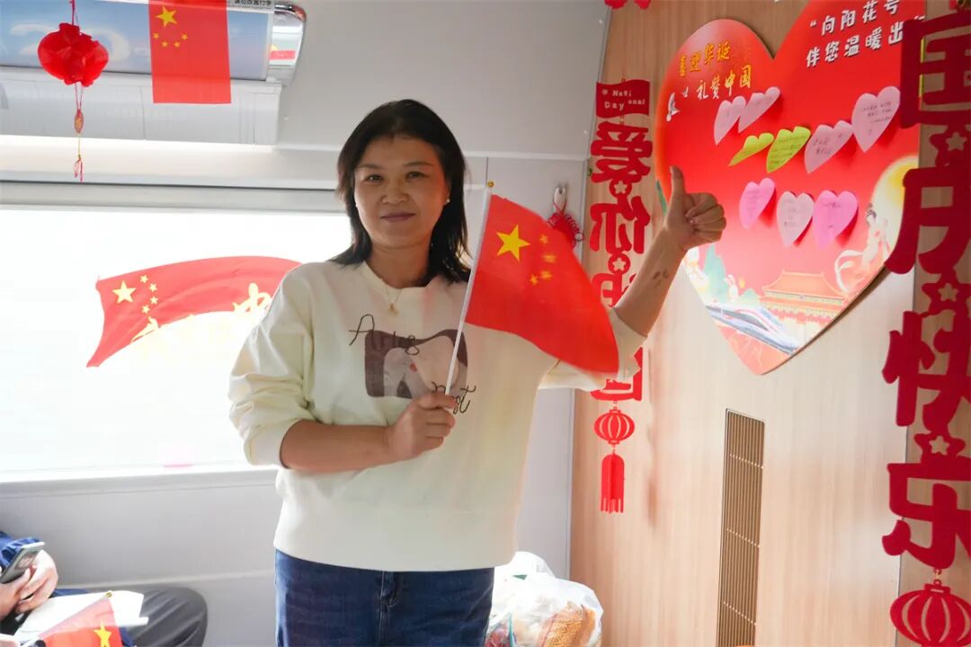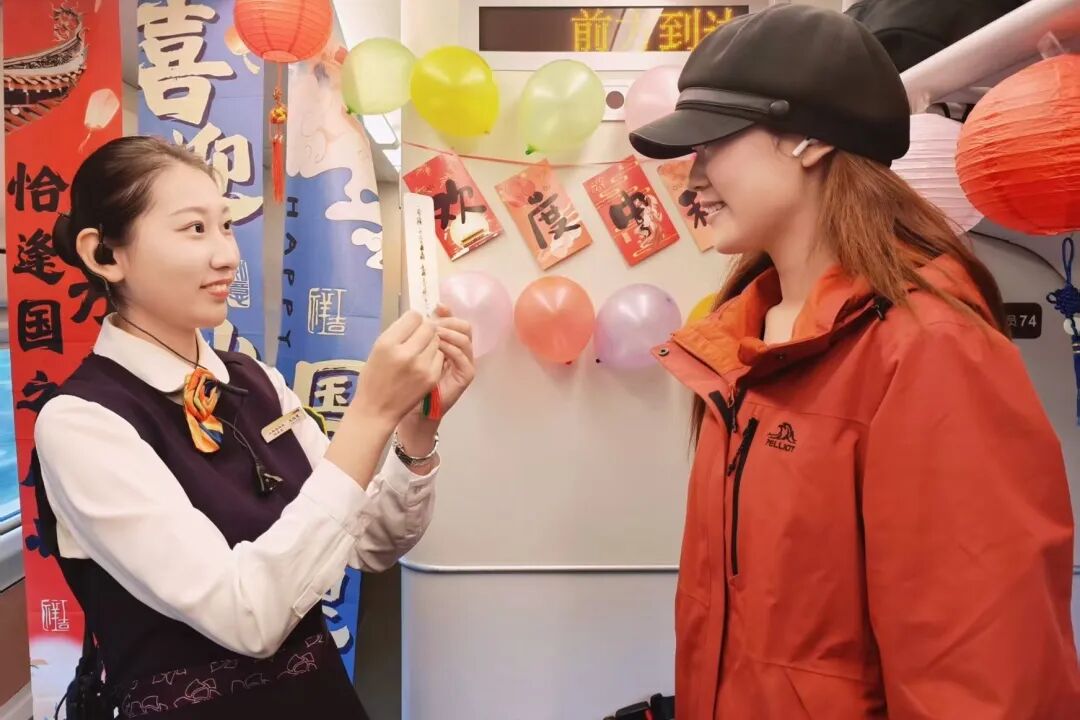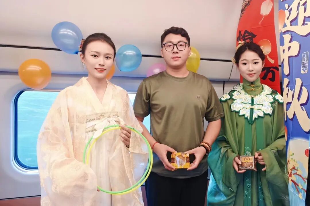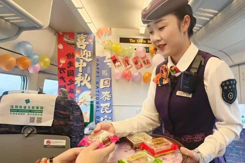 熱鬧的活動(dòng)讓車(chē)廂變成歡樂(lè)的海洋,列車(chē)員將月餅等精美伴手禮送給旅客,為他們送上節(jié)日的祝福。