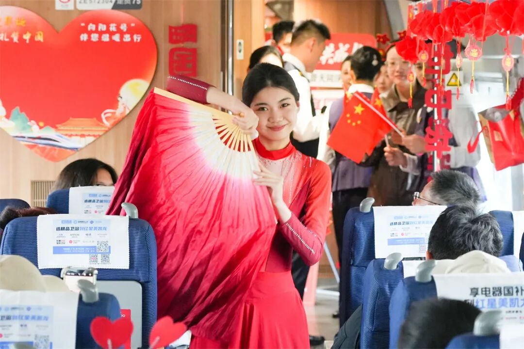 車(chē)廂內(nèi)掛滿(mǎn)條幅、彩帶和中國(guó)結(jié),洋溢著節(jié)日的喜慶氛圍。在舞蹈《親愛(ài)的你啊》的優(yōu)美旋律中,列車(chē)聯(lián)歡拉開(kāi)序幕。