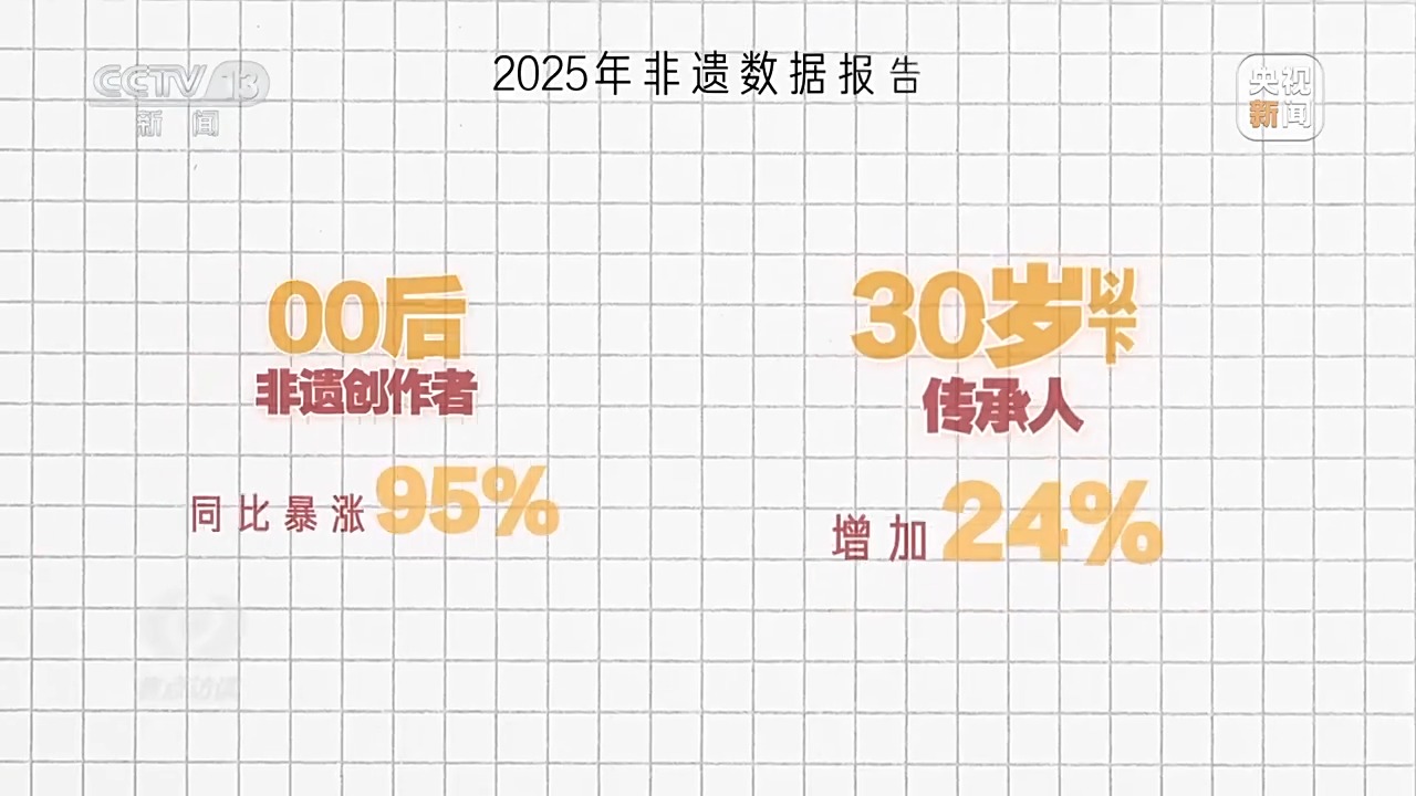 也許有人覺得這些故事太個別,所以我找到了某短視頻平臺今年的非遺數(shù)據(jù)報告,也很能說明問題。報告中提到,一年來00后非遺創(chuàng)作者同比暴漲95%,30歲以下傳承人增加24%。越來越多年輕人主動扛起了傳承的擔子。為啥他們愿意一頭扎進這些“老行當”?我找到了幾位新生代代表性傳承人,試著解開這份“偏愛”背后的密碼。
