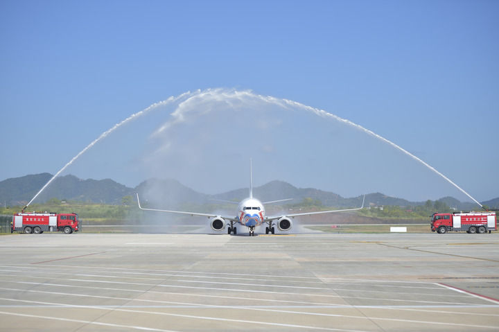 2025年9月28日,由中國國際航空執(zhí)飛的北京大興至瑞金航班飛抵瑞金機場后通過“水門”。新華社發(fā)(楊鑫 攝)