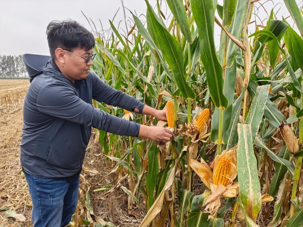2025年10月10日,安徽省宿州市蕭縣金旺家庭農(nóng)場(chǎng)負(fù)責(zé)人許大賓查看待收割的玉米品質(zhì)。新華社記者 水金辰 攝