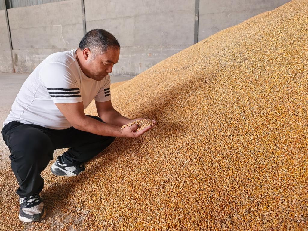 2025年10月10日,在安徽省宿州市蕭縣劉套鎮(zhèn),三大家村黨總支書(shū)記高杰查看剛烘好的玉米。新華社記者 水金辰 攝