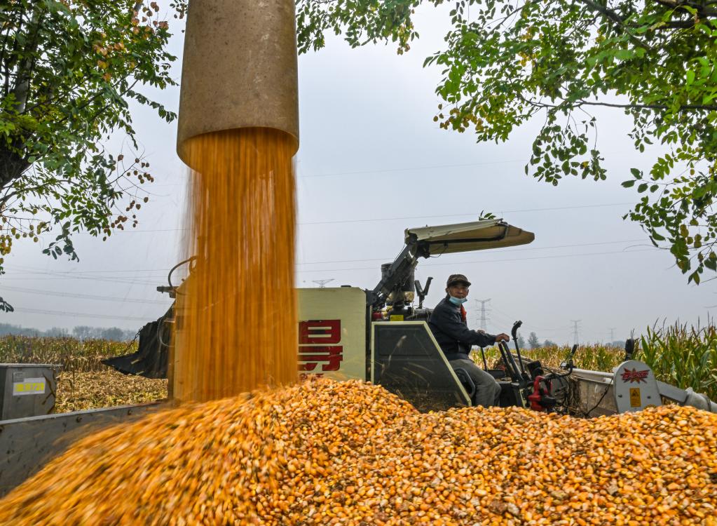 2025年10月8日,河南省商丘市夏邑縣會(huì)亭鎮(zhèn)郭樓村農(nóng)民駕駛收割機(jī)收獲玉米。新華社發(fā)(王高超 攝)
