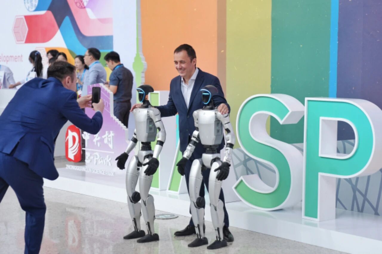 2025年9月17日,國(guó)際科技園及創(chuàng)新區(qū)域協(xié)會(huì)(IASP)2025年世界大會(huì)在北京國(guó)家會(huì)議中心開(kāi)幕。圖為外籍嘉賓在大會(huì)現(xiàn)場(chǎng)同機(jī)器人合影。中新社記者 張祥毅 攝