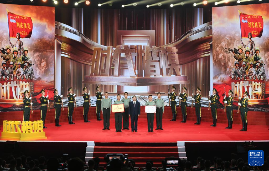 在“時(shí)代楷模”發(fā)布儀式上,陸軍某合成旅合成二營裝甲步兵一連(“劉老莊連”)官兵代表領(lǐng)取“時(shí)代楷?!豹?jiǎng)牌和證書(9月29日攝)。新華社發(fā)(華夏 攝)