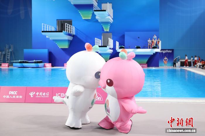 11月11日,第十五屆全國運動會跳水項目女子3米跳板決賽在廣東省奧體中心游泳跳水館舉行。圖為比賽前,十五運會吉祥物帶來暖場表演。 中新社記者 陳楚紅 攝