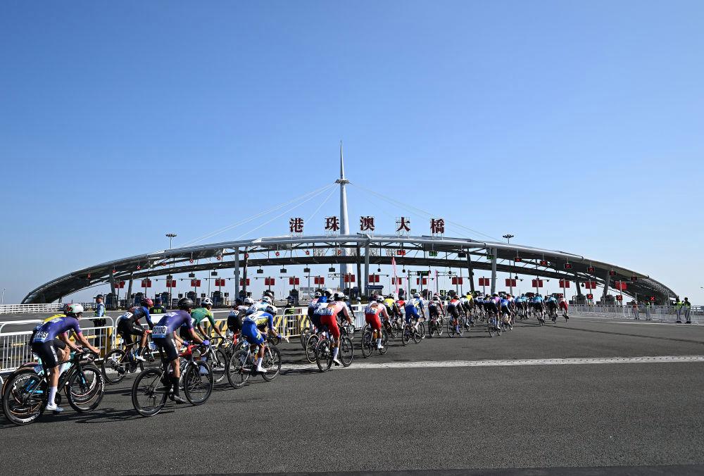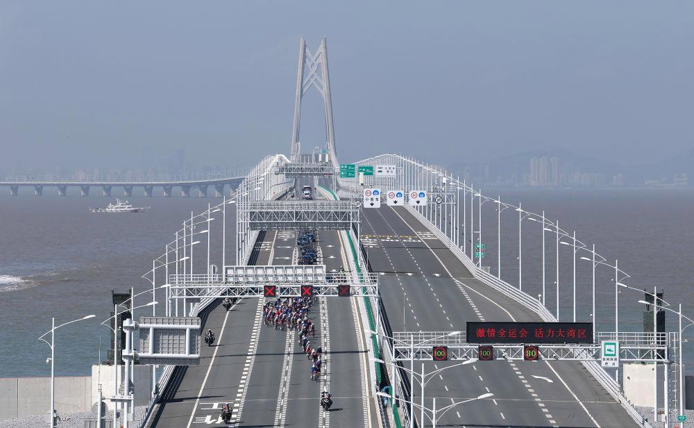 11月8日,在第十五屆全國(guó)運(yùn)動(dòng)會(huì)公路自行車男子個(gè)人賽決賽中,參賽選手在港珠澳大橋騎行。新華社記者梁旭 攝