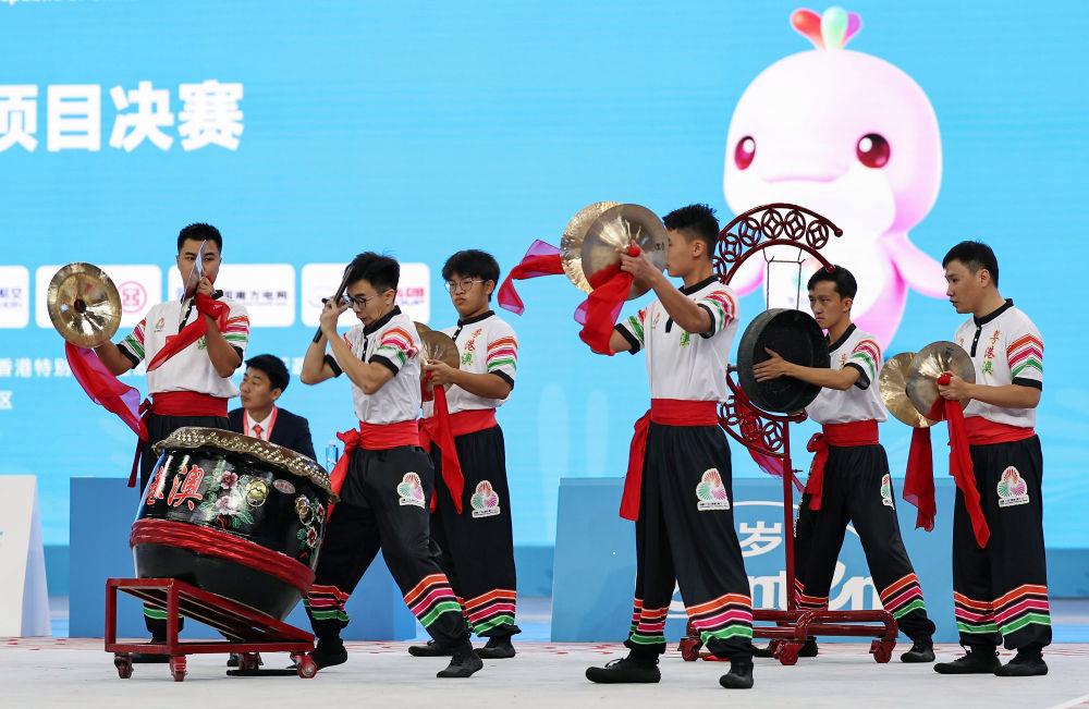 11月11日,粵港澳聯(lián)隊(duì)在第十五屆全國(guó)運(yùn)動(dòng)會(huì)群眾展演舞龍舞獅南獅自選項(xiàng)目決賽比賽中。新華社記者 王鵬 攝