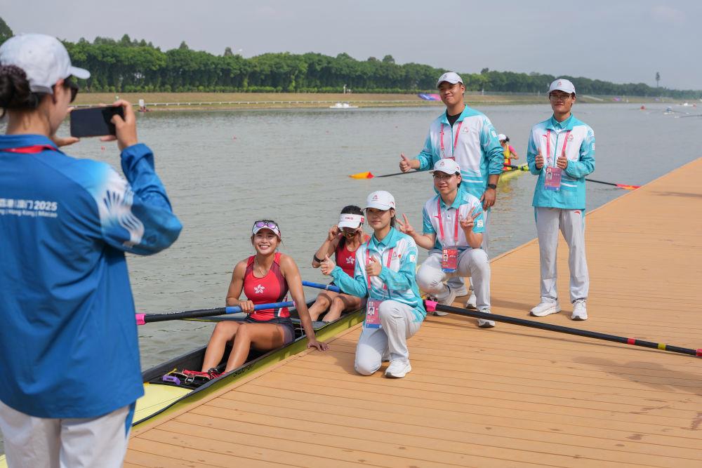 11月8日,香港隊(duì)賽艇選手黃湘儀/梁瓊允在女子雙人單槳半決賽后與志愿者合影留念。新華社記者 肖恩楠 攝