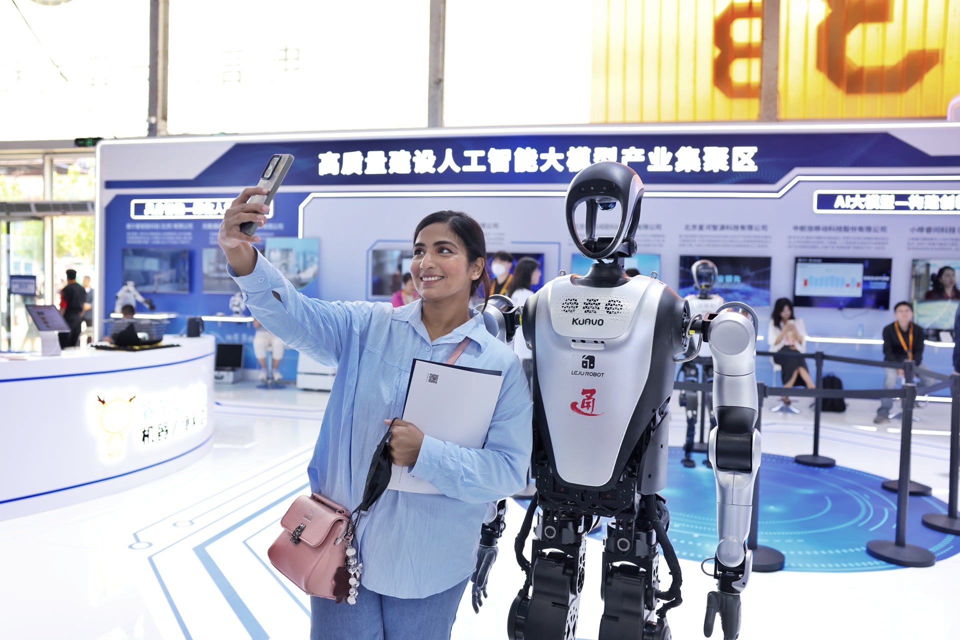 服貿會上,外國觀眾與機器人合影。 潘之望 攝