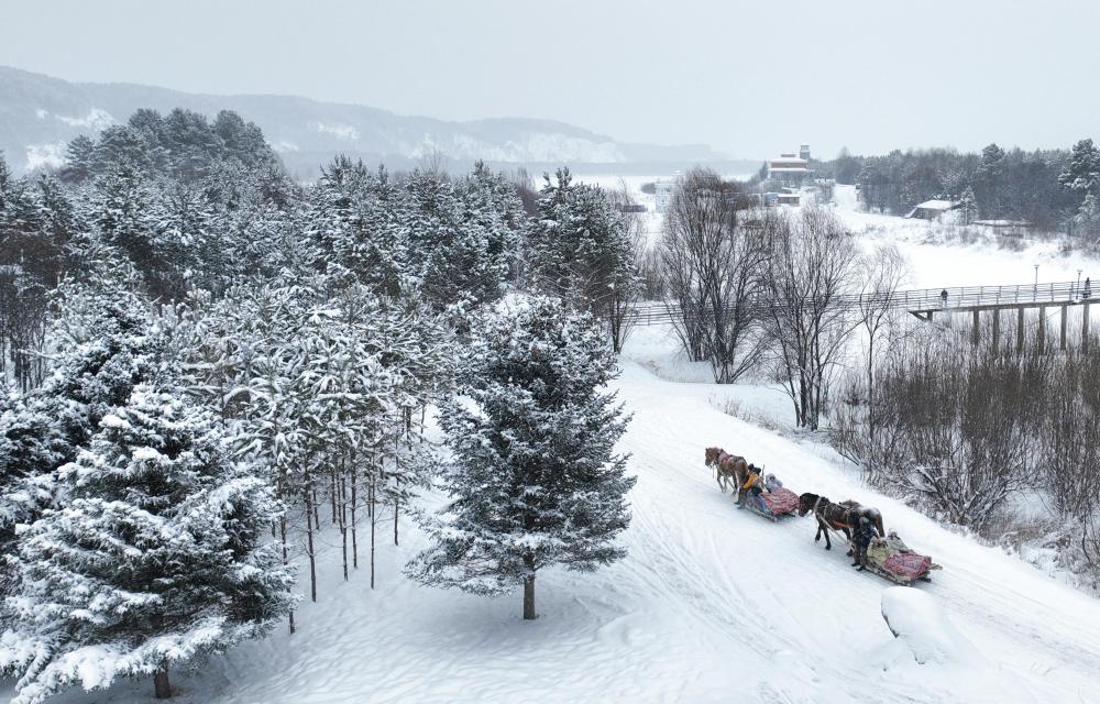 2024年11月27日,游客在黑龍江省漠河市北極村體驗馬拉爬犁項目(無人機照片)。新華社發(fā)(徐率 攝)