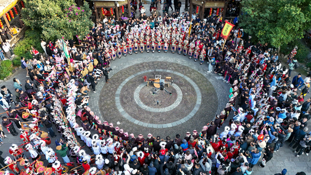 2024年11月30日,侗族群眾在貴州省黔東南苗族侗族自治州黎平縣肇興侗寨進行文藝表演(無人機照片)。新華社發(fā)(王純亮 攝)