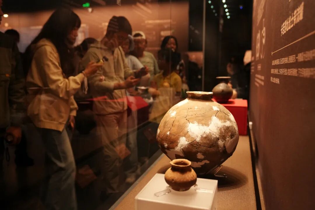 2025年7月15日,在位于拉薩的西藏博物館,卡若遺址出土的陶器吸引觀眾。 中新社記者 張祥毅 攝