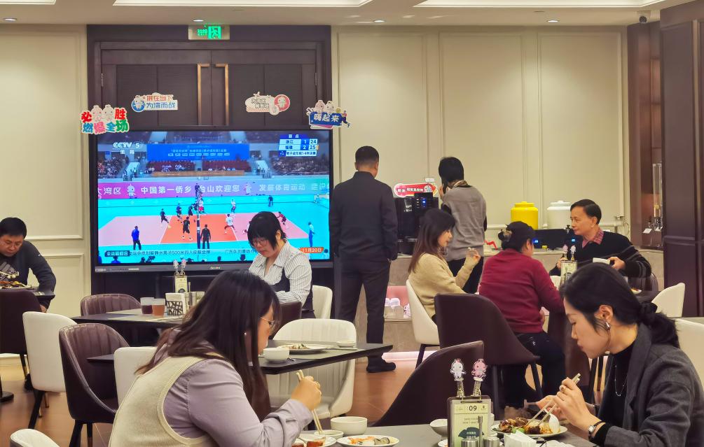 11月20日,游客在廣州一家餐廳內(nèi)用餐,一旁的電視正轉(zhuǎn)播全運會比賽。新華社記者洪澤華 攝