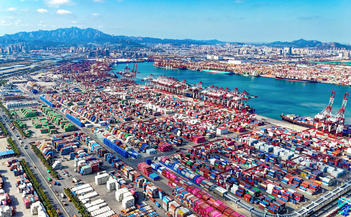 貨輪在青島自貿片區(qū)裝卸貨物(2025年11月5日攝,無人機照片)。新華社發(fā)(張進剛攝)