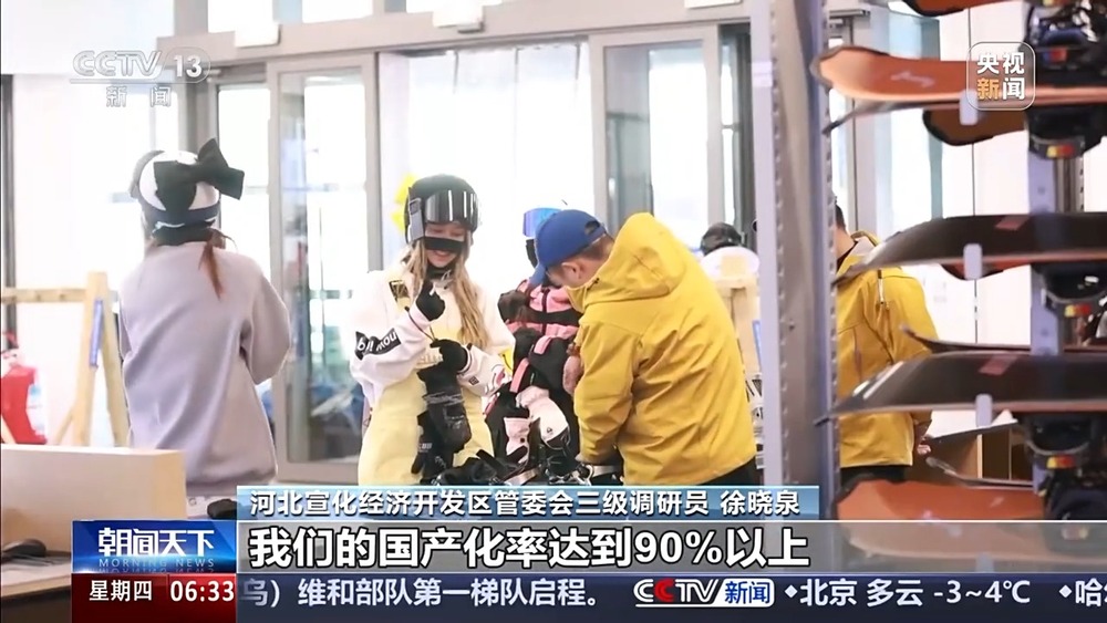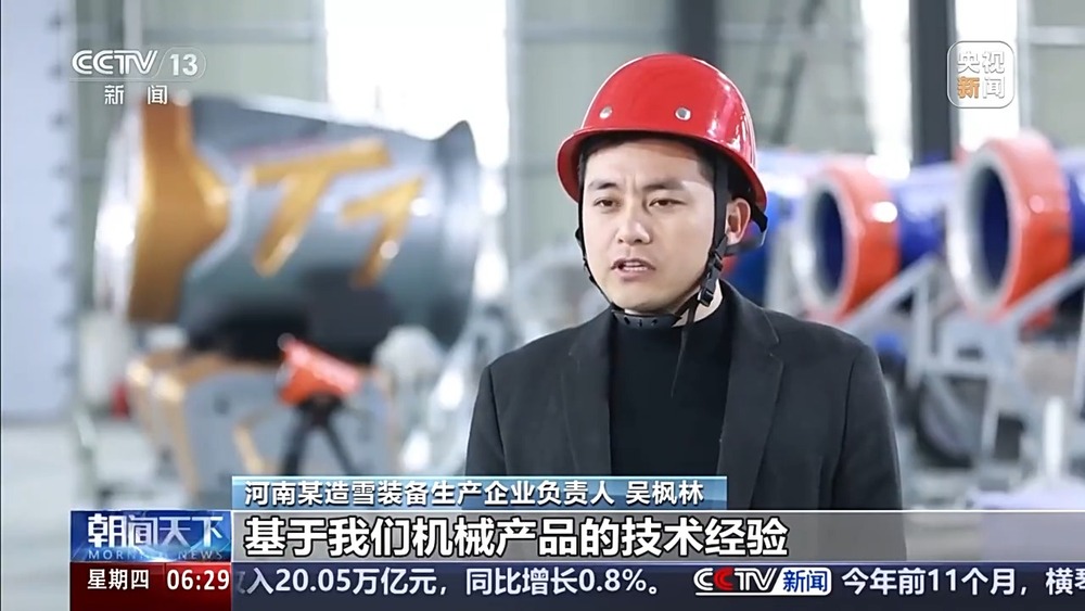 總臺央視記者 杜思源:冰雪產(chǎn)業(yè),從造雪制冰開始,到滑雪場的纜車、壓雪車等設(shè)施,再到我們使用的雪服雪板等等,涉及的門類繁多。推動冰雪經(jīng)濟(jì)高質(zhì)量發(fā)展,不同產(chǎn)線的協(xié)作、區(qū)域間的高效協(xié)同,至關(guān)重要。我現(xiàn)在是在河北崇禮的一家滑雪場,距離這里一個小時車程,就是當(dāng)?shù)氐谋┊a(chǎn)業(yè)園。在京津冀地區(qū)的多個雪場,都有來自這座產(chǎn)業(yè)園的冰雪裝備。
