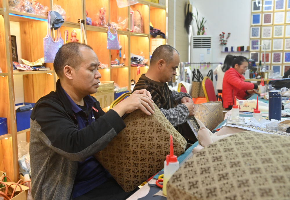 在廣西賓陽(yáng)壯錦文創(chuàng)館,工人制作壯錦文創(chuàng)產(chǎn)品。廣西賓陽(yáng)縣有著悠久的壯錦生產(chǎn)歷史。近年來(lái),該縣在傳統(tǒng)壯錦生產(chǎn)的基礎(chǔ)上,積極推動(dòng)壯錦文創(chuàng)產(chǎn)業(yè)發(fā)展,拓寬了當(dāng)?shù)貏趧?dòng)就業(yè)渠道。新華社記者 陸波岸 攝