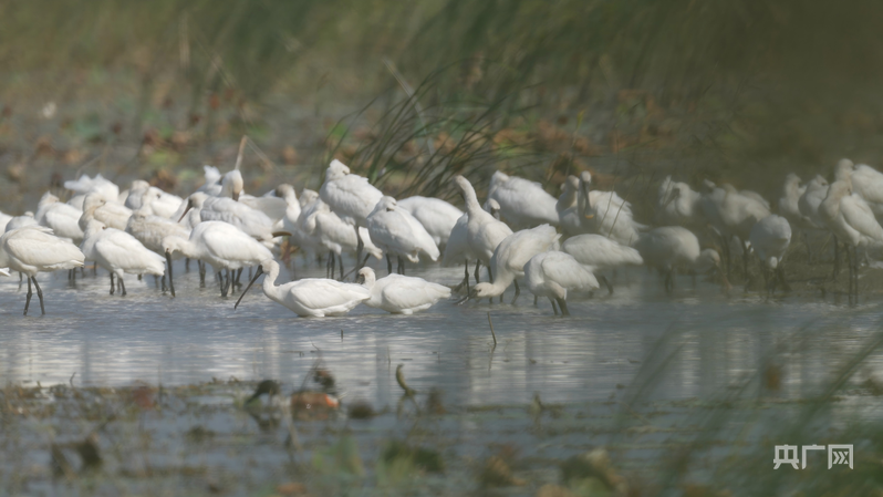 成群的黑臉琵鷺在淺灘上覓食、棲息(央廣網(wǎng)發(fā) 陳嚴雪 攝)