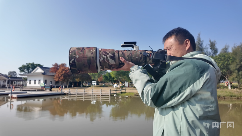 一看到水鳥的精彩瞬間,陳嚴雪立馬端起相機抓拍(央廣網(wǎng)見習記者 于東冉 攝)