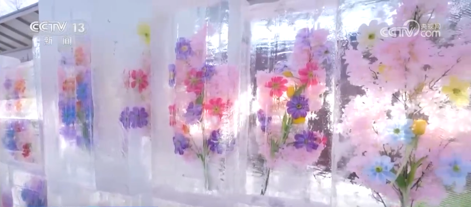 看完了霧凇,剛才說(shuō)到的冰雕在哪里呢?大家看這面鮮花冰墻就是進(jìn)入冰雕觀(guān)賞區(qū)的標(biāo)志:它以冰塊為載體,嵌入了青海本土的郁金香、格?;?,還有西寧市花丁香花,嬌艷色彩與冰晶的純凈相互映襯。