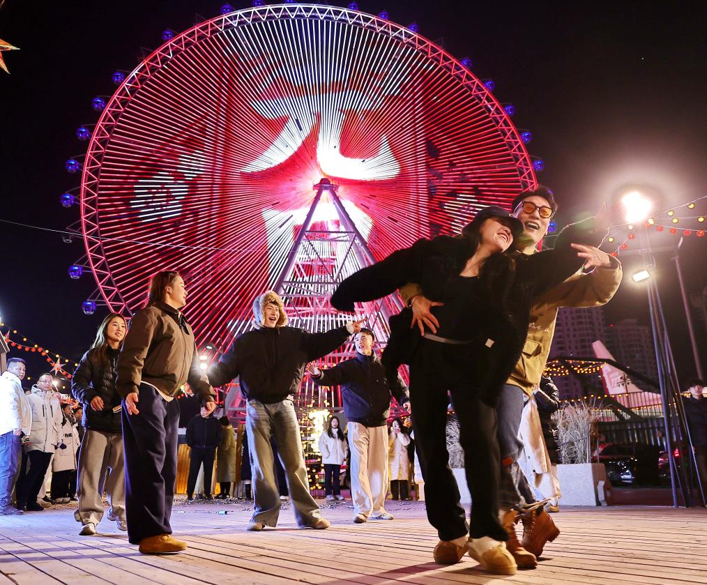 1月1日凌晨,游客在河北省秦皇島市海港區(qū)的摩天輪前跳舞,迎接新年的到來。新華社發(fā)(曹建雄攝)