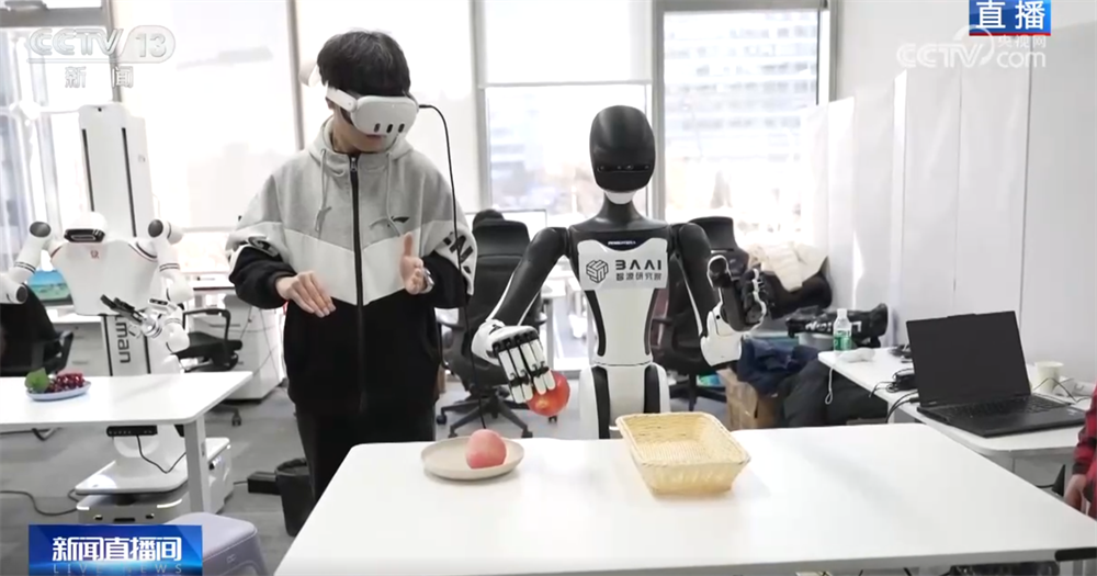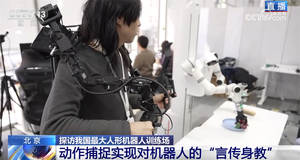 那您可能要問了,老師教學生講究一個“言傳身教”,那么,訓練師和機器人之間是怎么交流的呢?您看,這位戴著VR眼鏡、拿著操作手柄的訓練師就正在給這臺機器人上課。還有您看,當訓練師按操作鍵時,機器人的手臂可以移動、手指也會進行抓取。還有的訓練師會穿上布滿傳感器的動作捕捉衣,讓機器人可以在更精準的數(shù)據(jù)指導下進行訓練。機器人就是在這些數(shù)據(jù)的傳輸中,一遍一遍模仿,反復練習,從而提高每個動作的精準度。