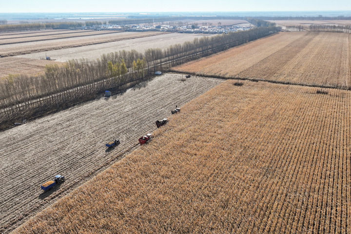 2024年10月16日,在黑龍江省肇東市五里明鎮(zhèn)東升村,農(nóng)民駕駛農(nóng)機(jī)進(jìn)行收割作業(yè)(無人機(jī)照片)。新華社記者 謝劍飛 攝