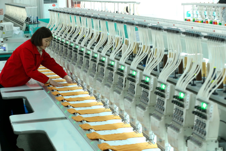 2月22日,山東省青島市即墨區(qū)即發(fā)集團有限公司的工人在繡花生產(chǎn)線上忙碌。新華社發(fā)(梁孝鵬 攝)