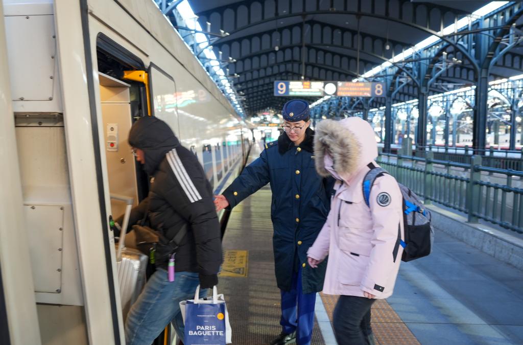 中國(guó)鐵路哈爾濱局集團(tuán)有限公司工作人員(中)在哈爾濱火車(chē)站為旅客服務(wù)。李昕洋 攝