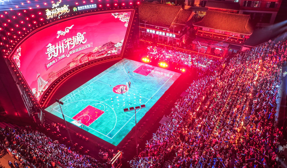 2026年2月3日,觀眾在貴州省臺(tái)江縣臺(tái)盤鄉(xiāng)“村BA”球場(chǎng)觀看貴州“村晚”(無(wú)人機(jī)照片)。