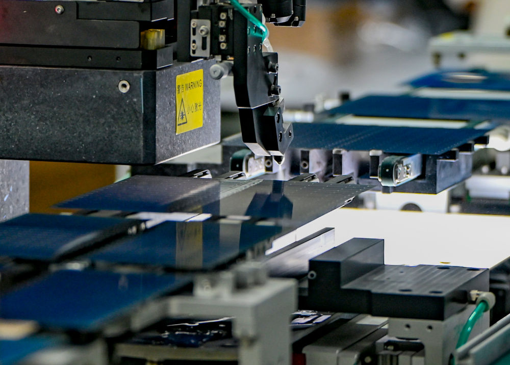 在新疆巴音郭楞蒙古自治州若羌縣一家新能源有限公司,全自動劃片機在切割光伏電池片(2025年9月22日攝)?!笆奈濉逼陂g,電動汽車、光伏產(chǎn)品、鋰電池等“新三樣”產(chǎn)品2025年出口規(guī)模接近1.3萬億元,比2020年增長3.5倍。