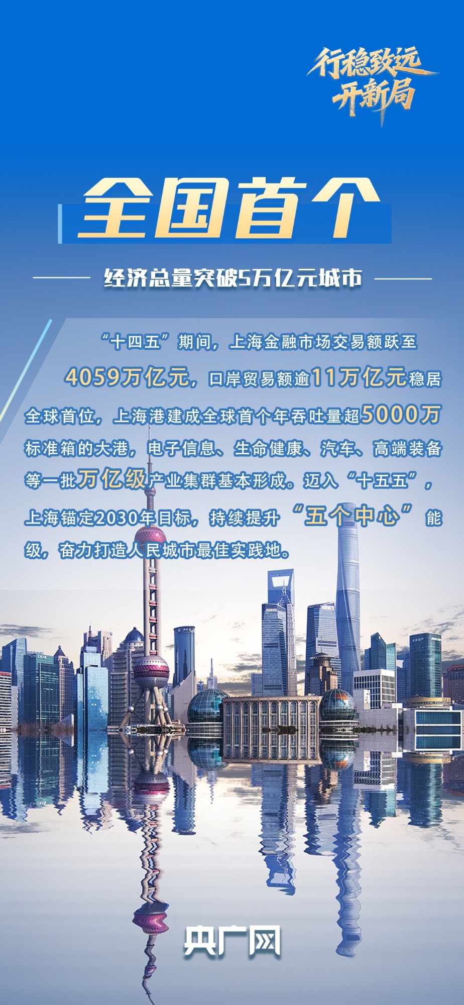 “十四五”期間,上海聚焦建設(shè)國(guó)際經(jīng)濟(jì)中心、金融中心、貿(mào)易中心、航運(yùn)中心、科技創(chuàng)新中心的重要使命,綜合實(shí)力實(shí)現(xiàn)新跨越。全市生產(chǎn)總值從4.16萬(wàn)億元增加到5.67萬(wàn)億元,成為全國(guó)首個(gè)經(jīng)濟(jì)總量突破5萬(wàn)億元的城市,躋身全球城市前五位。成績(jī)單背后,既是上?!拔鍌€(gè)中心”建設(shè)的階段性成效,更是“十五五”期間邁向更高能級(jí)的底氣所在。