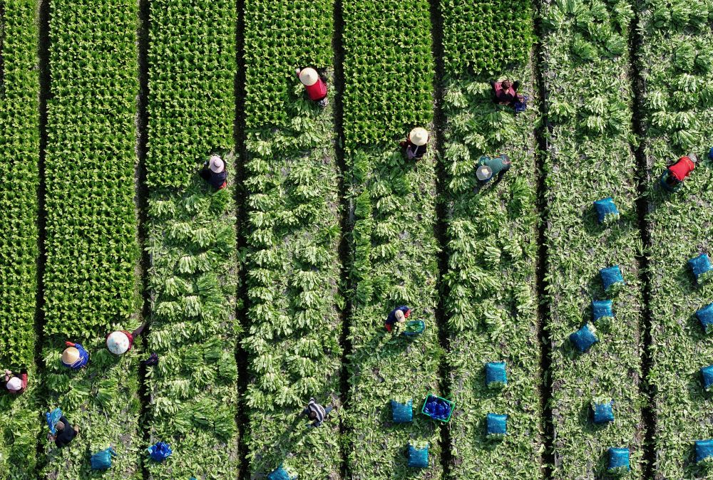 2026年2月24日,農(nóng)民在四川彭州市九尺鎮(zhèn)玉源社區(qū)的田地里采收油麥菜(無人機(jī)照片)。新華社發(fā)(羅國(guó)楊 攝)