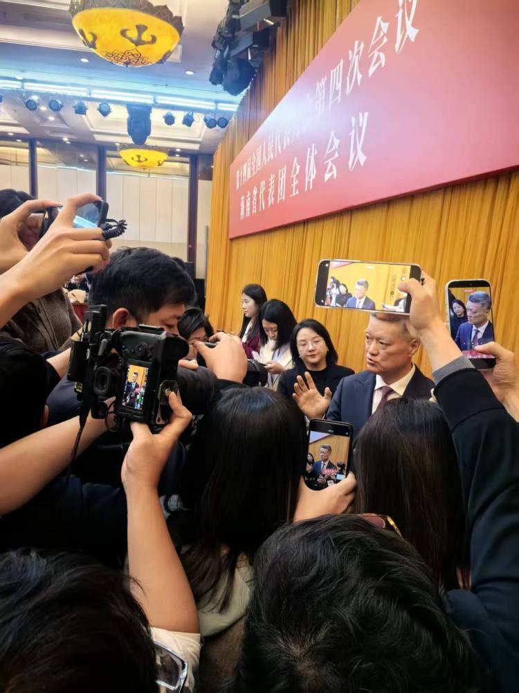 △海南代表團開放團組活動,中外媒體記者會后采訪全國人大代表、海南省人民政府秘書長蔡強 。林路攝