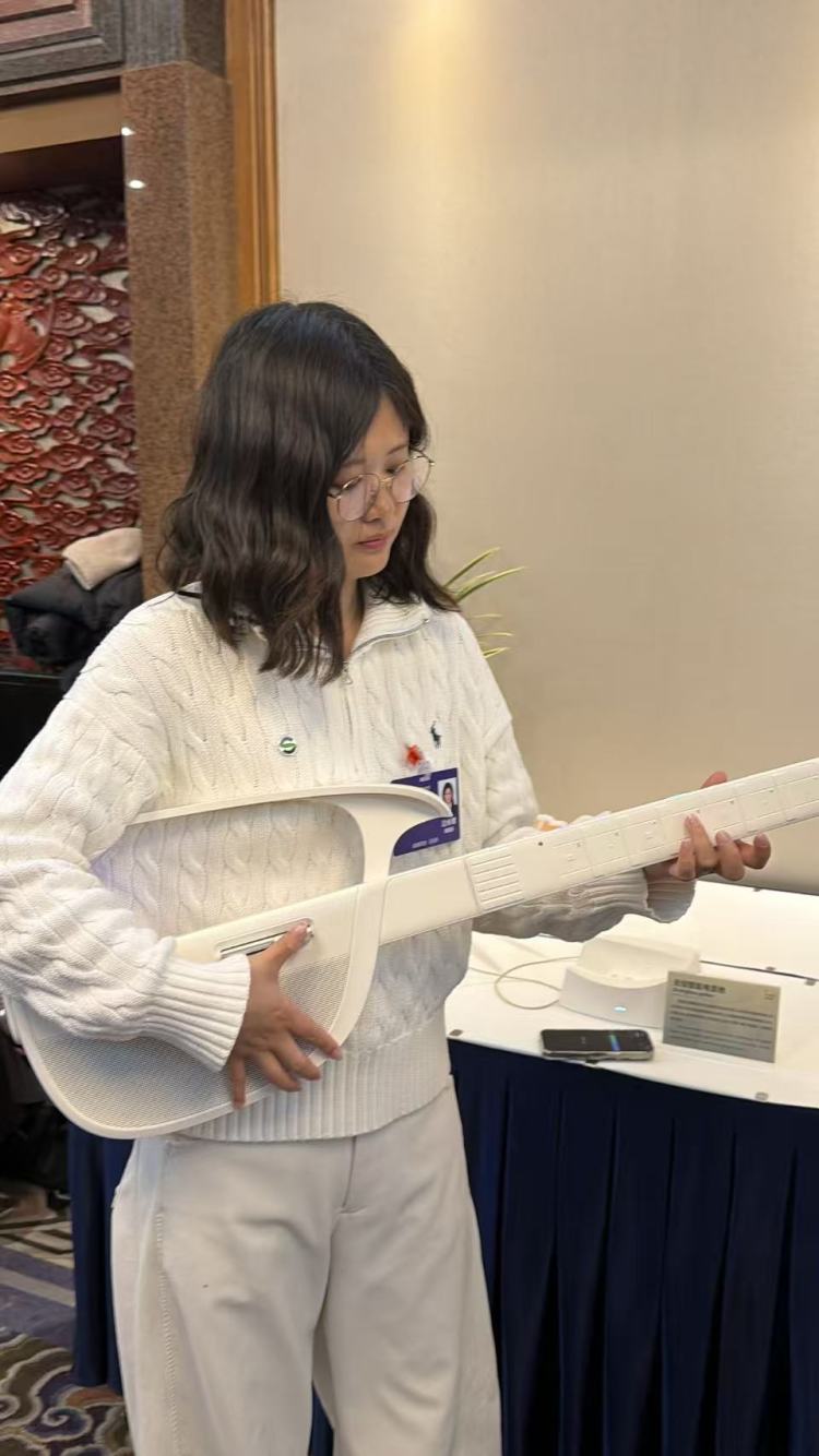 △廣東代表團的工作人員邊詠馨介紹,這把AI吉他,可以讓人3秒鐘學會彈吉他。 林路攝