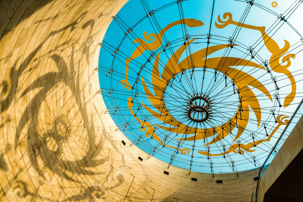 這是陽光透過成都金沙遺址博物館陳列館穹頂,在墻壁上投下太陽神鳥造型的影子(2022年3月10日攝)。新華社發(fā)(張艷攝)