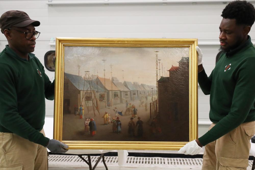 3月11日,在法國巴黎近郊的凡爾賽宮,工作人員準(zhǔn)備打包油畫《南京的集市》。在2024年中法建交60周年暨中法文化旅游年之際,凡爾賽宮和故宮博物院將于4月至6月在故宮共同舉辦“凡爾賽宮與紫禁城”展覽。新華社記者高靜攝