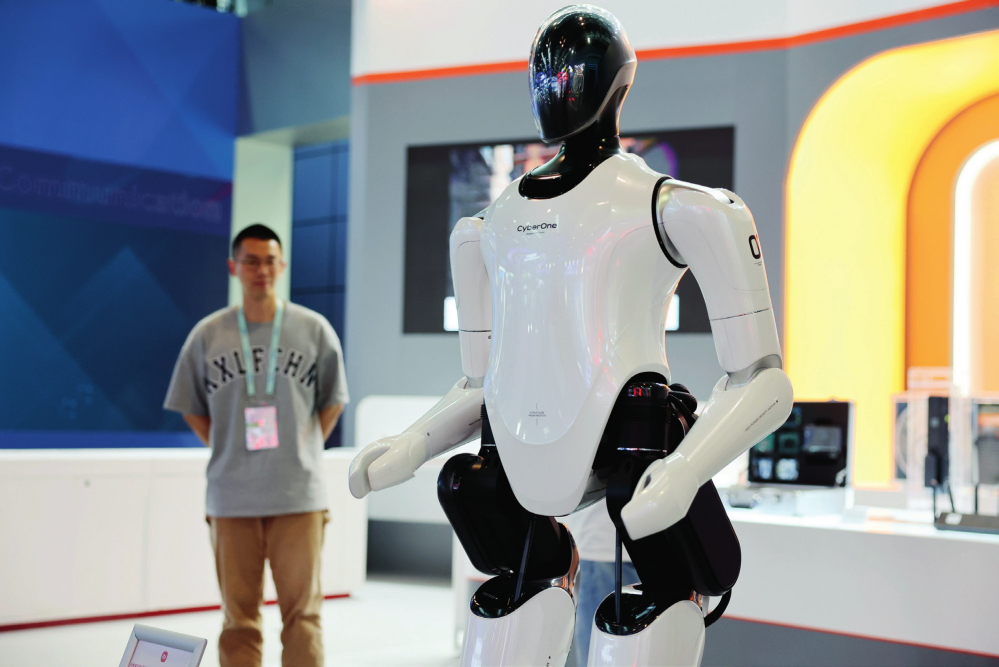 位于中關(guān)村國家自主創(chuàng)新示范區(qū)展示中心的一款全尺寸人形仿生機(jī)器人(2023 年 5 月 26 日攝)張晨霖攝 / 本刊