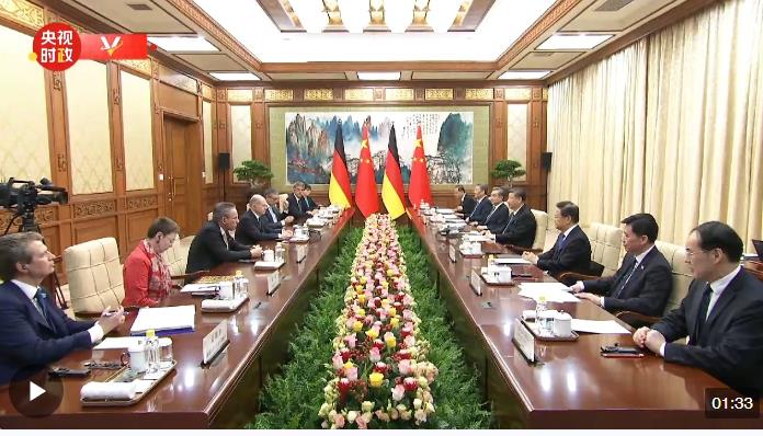 朔爾茨說(shuō):“主席先生,我很高興自2022年11月我上次來(lái)訪之后,兩國(guó)政府間進(jìn)行了深入的交流和多次對(duì)話。具有里程碑意義的是,去年六月在柏林成功召開(kāi)的第七輪德中政府間磋商。在過(guò)去兩天我率領(lǐng)一個(gè)商務(wù)代表團(tuán),參觀了在重慶和上海的德國(guó)企業(yè),兩國(guó)的經(jīng)濟(jì)關(guān)系是非常重要的議題。”