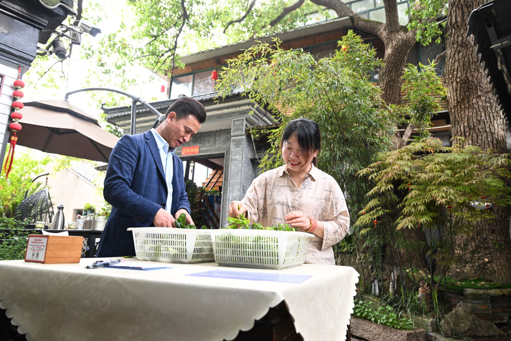 2024年4月11日,在江蘇省蘇州市吳中區(qū)金庭鎮(zhèn),退捕漁民沈雪榮和妻子沈燕燕在自家經(jīng)營(yíng)的農(nóng)家樂“美味漁家蟹園”擇菜。“退捕后,太湖的生態(tài)環(huán)境越來越好,游客越來越多,我們家的農(nóng)家樂生意也越來越紅火。”沈雪榮感慨道。