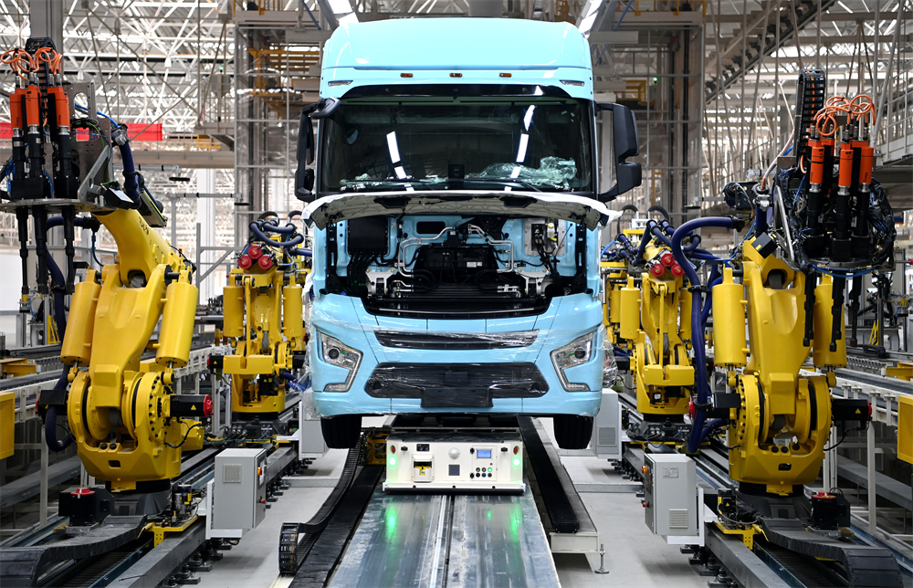△ 一輛重卡在汽車總裝生產(chǎn)線輪胎自動化裝配擰緊無人工作站進(jìn)行裝配。